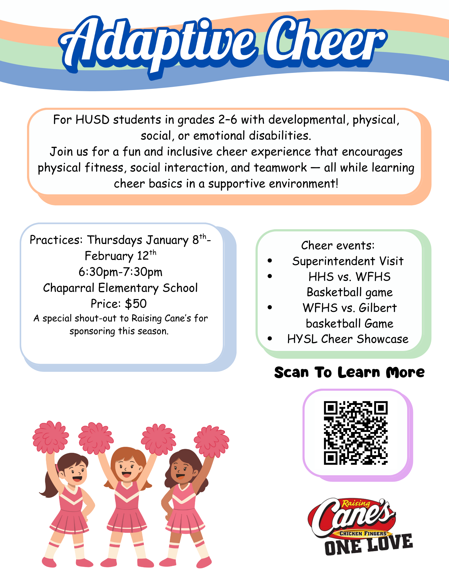 Adaptive Cheer: HUSD students in grades 2nd-6th with developmental, physical, social and emotional disabilities. We are offering a unique...